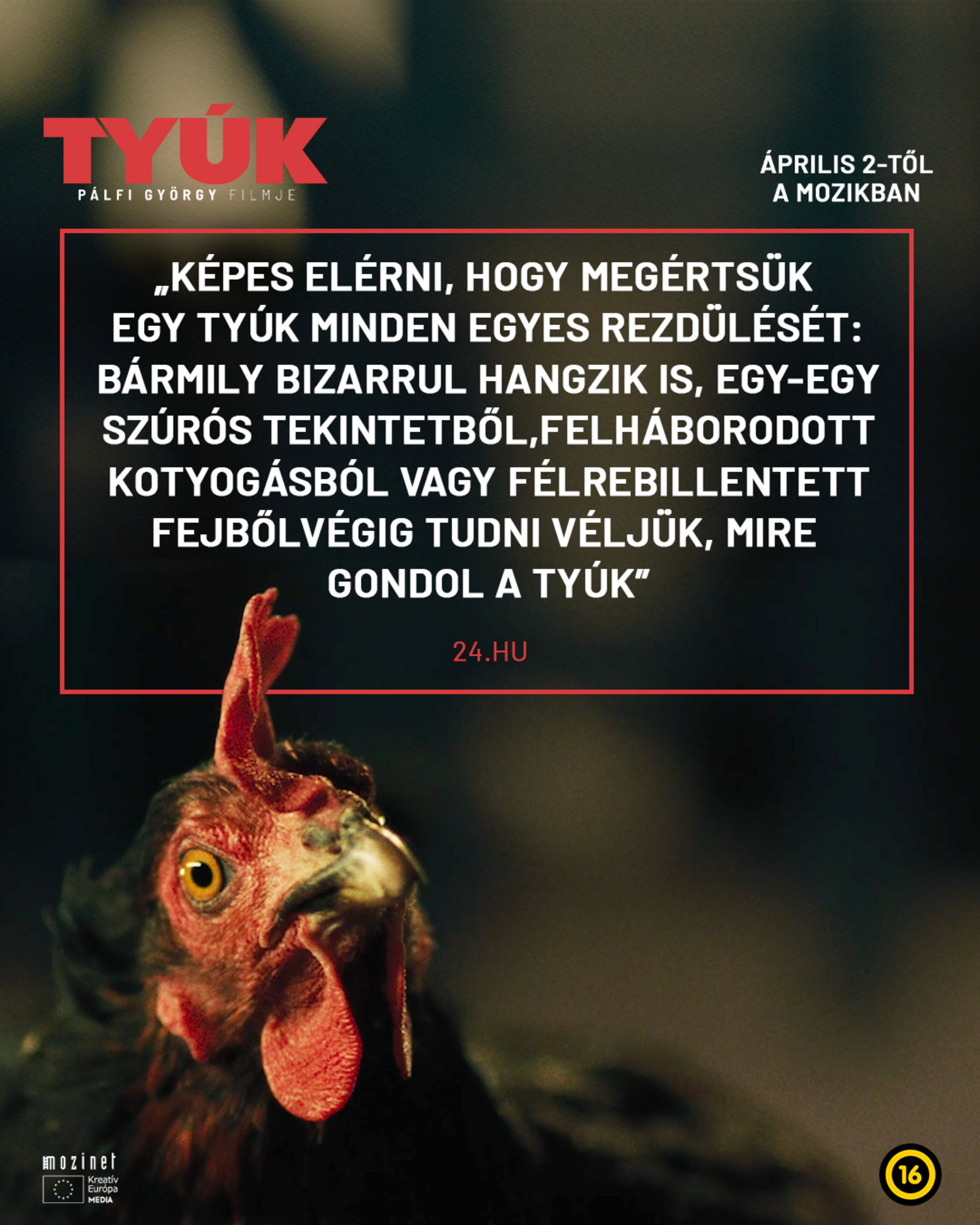 Valószínűleg Pálfi György, a kultikus Taxidermia és Hukkle rendezője az egyetlen, aki ezt a vizuálisan lenyűgöző, groteszk humorban bővelkedő és lebilincselően izgalmas filmet el tudta készíteni. A Tyúk Magyarországról nem kapott anyagi támogatást, ezért végül német-görög-magyar koprodukcióban készült el, a világ számos filmfesztiválja után pedig a 45. Magyar Filmszemle nyitófilmjeként mutatkozik be hazánkban. A címszereplőt nyolc különböző, Magyarországon született és kiképzett állat játssza, a lenyűgöző alakítások CGI nélkül születtek, Halász Árpád állatkoordinátor segítségével (Fehér isten, Szegény párák, Testről és lélekről). Pálfi ismét együtt dolgozott rendszeres alkotótársaival, többek között Ruttkay Zsófia forgatókönyvíróval és Lemhényi Réka vágóval, a magyar koproducer pedig Muhi András volt.